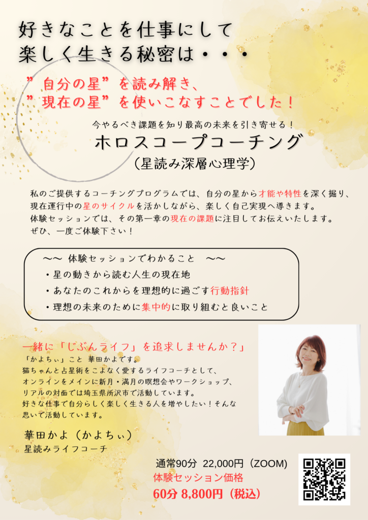 体験セッション かよちぃ お申し込みはこちらへ 【セッションのお客様の声はこちら】お申し込みはこちらへ かよちぃの公式メルマガ。 自然体で自分ライフ! 心が喜ぶ働き方で 毎日を豊かにの購読申し込みはこちら